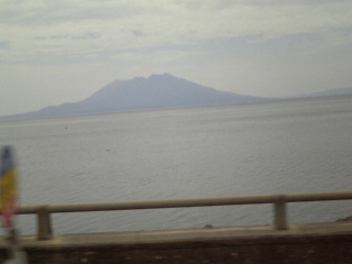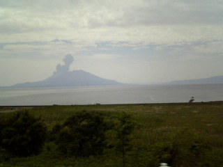 車窓から、桜島が見えましたぁ。 しかし、車が動いてる・・・・